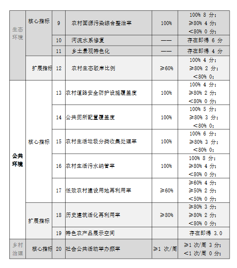 从乡村振兴视野出发,以村民为中心,遵循问题导向、目标导向与应用导向相结合的原则, 运用 newman 等(1996)创建的人类聚落扩展代谢模型为基本模型,构建出包涵 20 项指标在内的美丽乡村人居环境评估指标体系,其中 16 项核心指标,4 项扩展指标(表 1)。核心指标是乡村人居环境建设中最基本、最重要的评估指标项,是每个乡村个体均需要重点完善的目标方向,体现评估标准的标准化要求。扩展指标是针对乡村的多样化发展需求增设的“个性化”评估指标项,体现乡村发展的差异化实际需要,弥补评估标准的多样化需求“短板”。