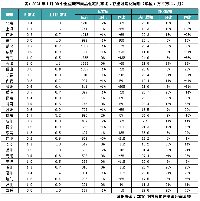 1月,供应缩量幅度大于成交,因而30个监测城市整体供求比继续走低,由上月的0.88降至0.81,7成城市转入阶段性供不应求,北京、福州等供求比更是跌至0.5以下。受此影响,30个重点城市库存面积小幅收缩,环比下降1%。