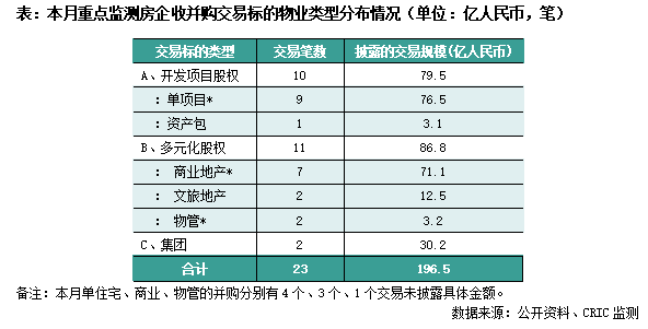 根据cric监测,2024年1月重点监测房企共涉及23笔并购交易,披露交易金额的有15笔,总交易对价约196.5亿人民币,同比减少31%、环比减少29.2%,年初并购热度有所下滑。
