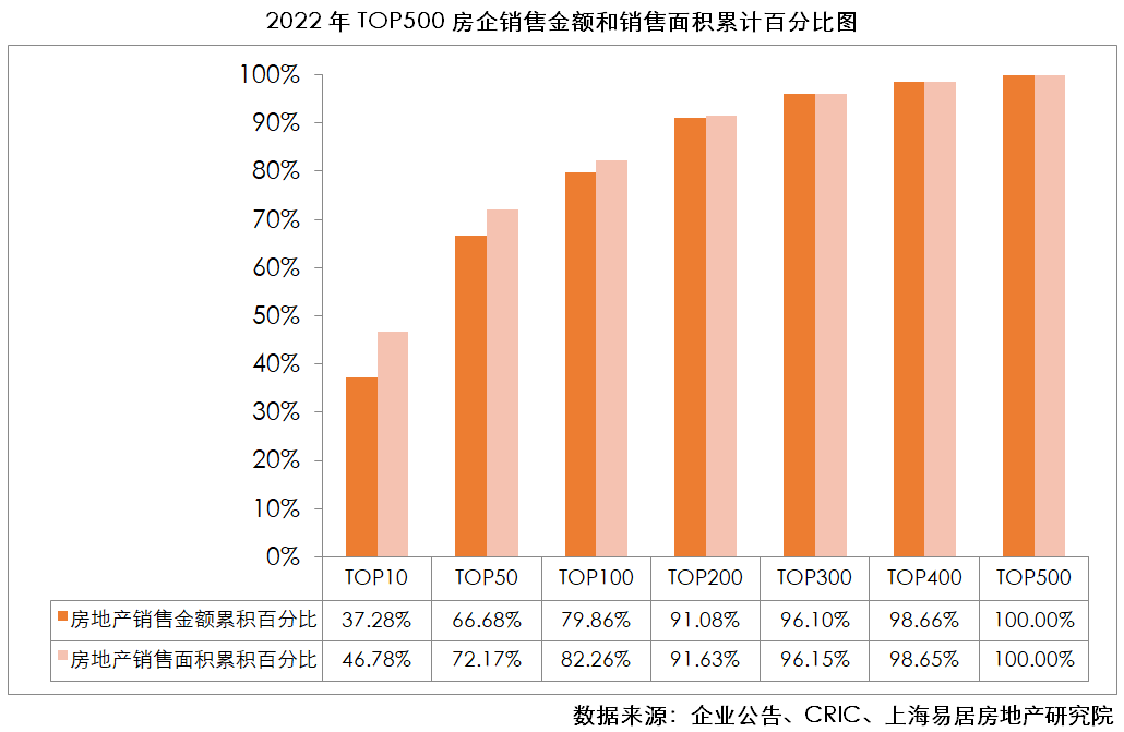 从本次测评结果来看,2022年top10、top50、top100、top200销售金额分别约占top500销售金额的37%、67%、80%、91%。相较于2021年的30%、65%、83%、92%,top10和top50房企集中度有所上升,可见在市场变动之下,头部房企的抗压能力更强,中小房企面临的压力更大。