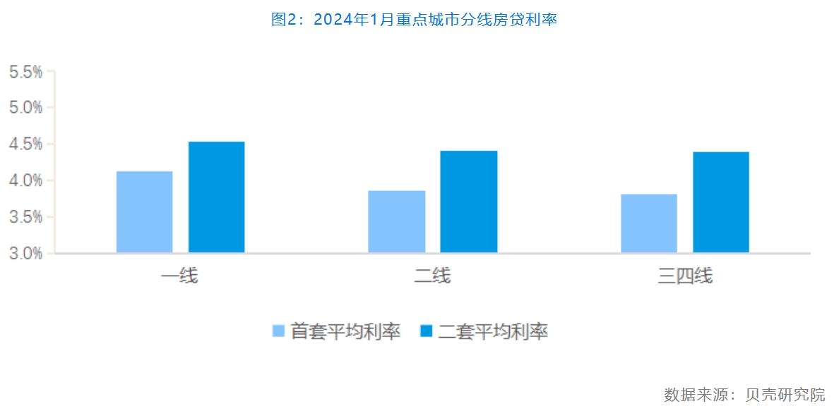 此外,从各线城市表现来看,1月份一线城市首二套房贷利率分别为4.13%、4.54%,均与上月持平;二线城市首套利率降低2bp至3.86%,三四线城市首套利率降低2bp至3.82%;二线和三四线城市二套利率均维持上月水平。