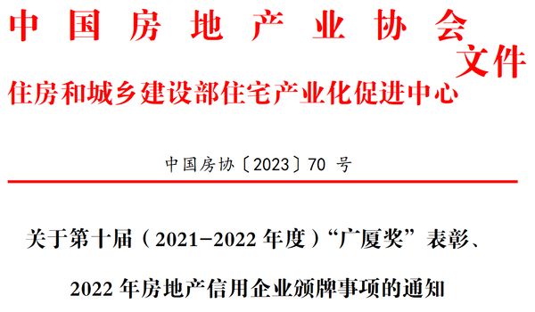 第十届(2021-2022年度)“广厦奖”表彰、2022年房地产信用企业颁牌定于2023年6月14-15日在上海市举办。现将具体事宜通知如下: